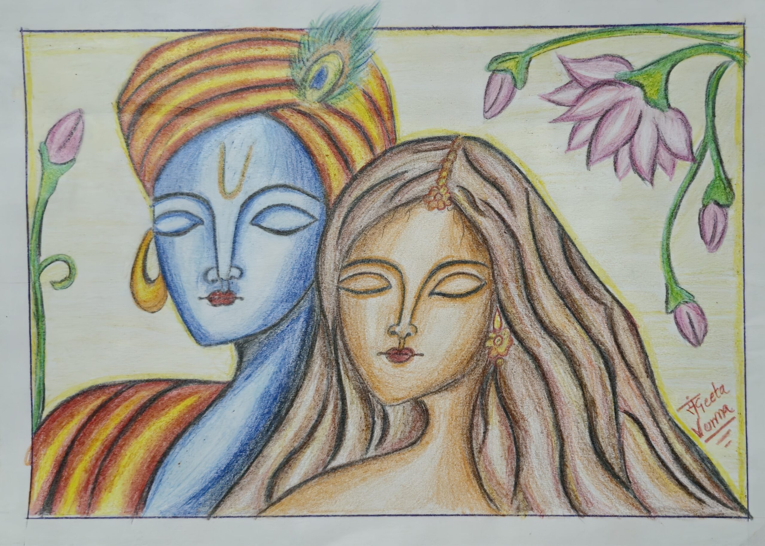 | A vibrant hand-drawn depiction of Lord Krishna and Radha, serene moment. Krishna is adorned with a yellow-orange turban crowned by a peacock feather, symbolizing divine love and grace, while Radha radiates beauty with flowing hair and delicate ornaments. Lotus flowers frame the scene, representing purity and spiritual connection. |