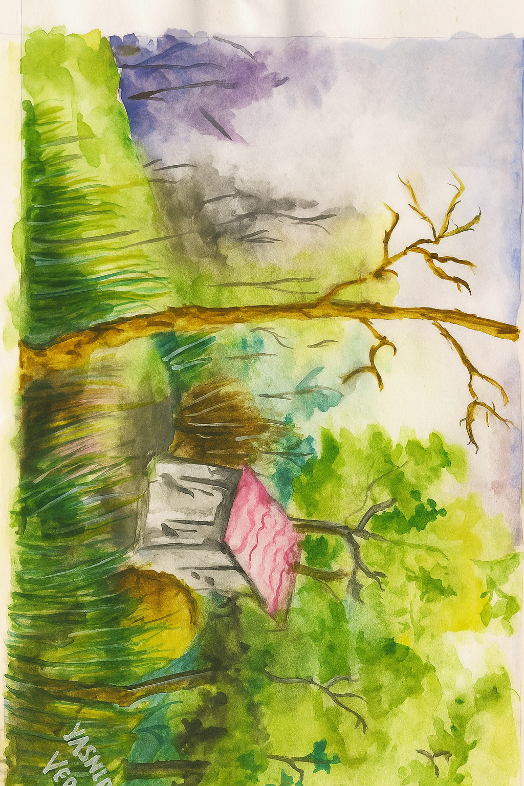 A watercolor painting showcasing a peaceful rural scene with a small white hut having a pink roof, surrounded by lush greenery, tall grasses, and trees. A large tree with bare branches stands tall, adding contrast to the vibrant green foliage. The background features a mix of colors representing cloudy skies and distant hills.