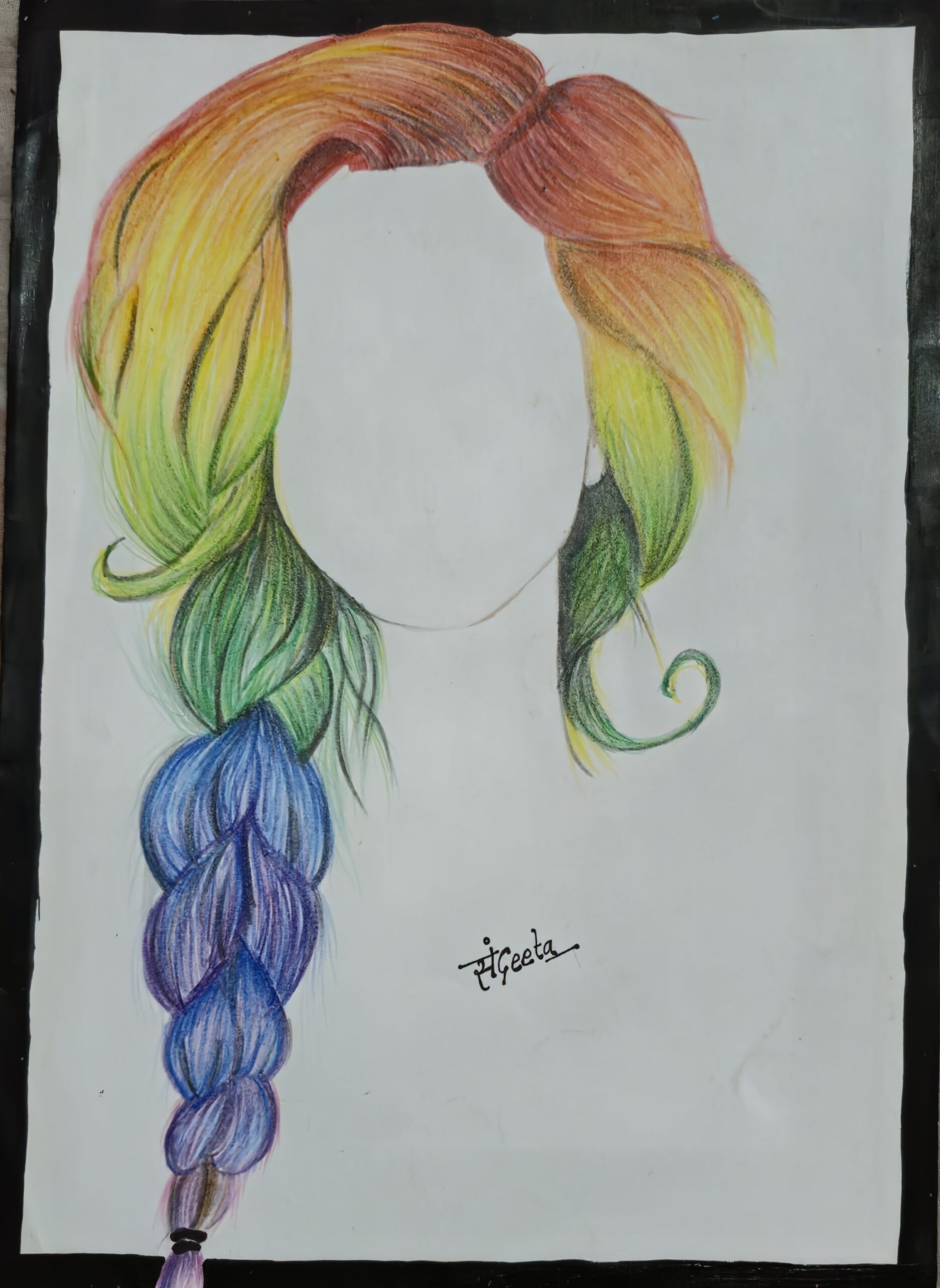 | A vibrant and colorful illustration of a faceless figure with flowing hair transitioning through the colors of the rainbow, styled into a long braid. The artwork celebrates creativity, individuality, and the beauty of diversity through bold color blending. |