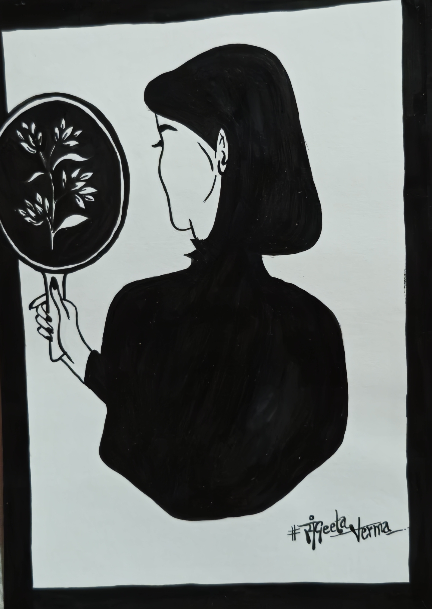 | A minimalistic black-and-white painting of a woman viewed from behind, holding a round mirror that reflects delicate floral patterns. The piece merges elegance and symbolism, suggesting self-reflection and inner beauty. |